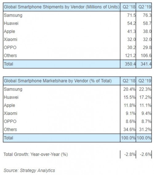 According to Strategy Analytics, global shipments fell by 2.6%. Samsung recorded a 1.9% increase, Huawei gained 1.7% and Apple lost 0.7% compared to the same period last year. Roughly, this means that Samsung sold 76.3 million units, Huawei 58.7 million devices, and Apple 38 million iPhones.