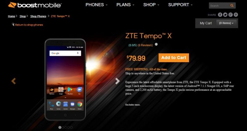 Boost Mobile, which offers variety of Android smartphones now have a new device on it's list : ZTE Tempo X. It's a budget friendly smartphone with 5'' display and 480p resolution. On back side we have 5MP main camera and for selfie shots there is a 2MP unit on front. Chipset is Qualcomm Snapdragon 210 which is very power efficient and should make decent battery life. Also there is 1GB of RAM and 8GB of internal storage. Device is based on Android 7.1.1 Nougat OS.