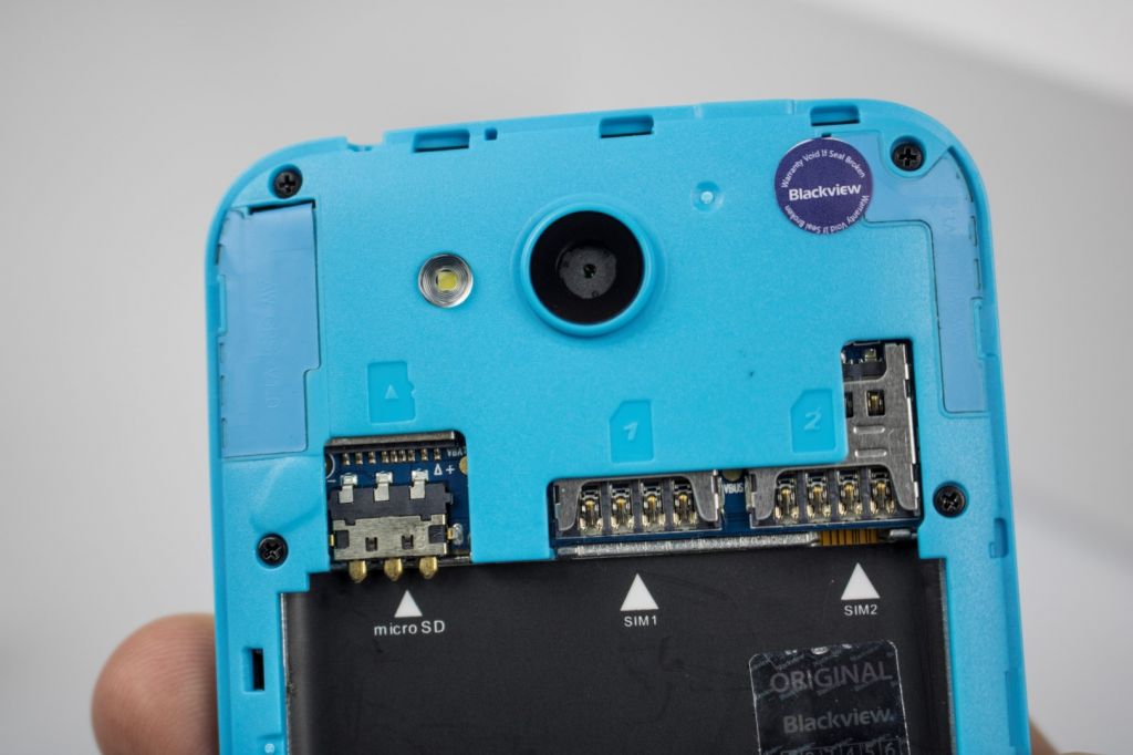 Blackview A5 uses a microUSB cable for charging and data transfer. This is a DualSIM device and it uses two physically separated microSIM card slots, next to which we can find a microSD card slot that supports expansions up to 32GB, which is an excellent addition considering the fact that the Blackview only has 8GB of internal storage.