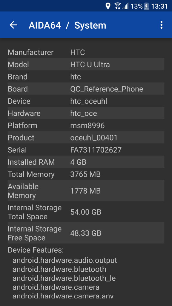 Taking into account that this device came out in January 2017, Qualcomm Snapdragon 821 was the only and the best chipset option. The next HTC flagship, the U11, was announced to have Snapdragon 835 chipset, which really suits a flagship device. Now very well-known Snapdragon 821 has 4 CPU cores and Adreno 530 GPU. The chipset is divided into 2 clusters with 2 cores clocked at 2.15GHz, and other 2 clocked at 1.6GHz. The RAM is 4GB DDR4, while there are 2 storage options: 64 and 128GB. All application and games run smoothly, start very quickly and don’t really represent a challenge for the powerful hardware of the U Ultra. When it comes to benchmarks, the U Ultra scores just slightly better that flagships equipped with the Snapdragon 820 chipset. When it comes to the rest of the hardware, the fingerprint sensor is put into the HOME button, a microSD card up to 128GB is also supported, and the slot for it is basically the slot for the second SIM card. Quick charging is realized through Qualcomm Quick Charge 3.0 system. U Ultra comes with the Android 7.0 Nougat version, and the system works flawlessly with no stuttering at all. Everything is only a few taps away, and in general, the system doesn’t have any bloatware.