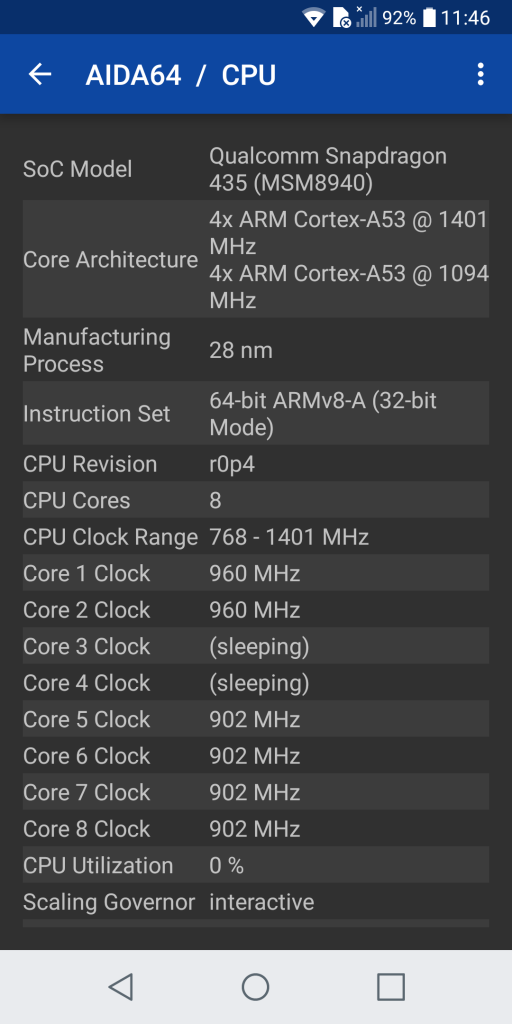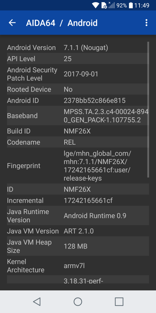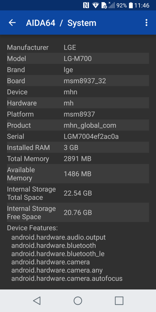 The LG Q6 uses the Snapdragon 435 chipset which is made for lower middle class smartphones and tablets. The choice of the CPU is not really ideal considering the resolution of the display, but on the other hand, you won’t have any problems during everyday use of the device. This chipset is based on 28nm process. Heavier use of the CPU can result in sudden overheating of the device, which prompts a drop in performances, but normal use will not put too much stress on it, and the device will work very nicely for a long time with no drops in performances. This is a 64-bit processor which contains 8 ARM Cortex-A53 cores clocked at 1.4 GHz. Adreno 505 GPU supports OpenGL ES 3.1, and it will execute all tasks rather well, but the resolution definitely poses a challenge for it. LPDDR3 RAM memory has the capacity of 3 GB, and it’s clocked at 800 MHz, which is more than enough for comfortable multitasking, and there is also 32 GB of storage which is, in theory, expandable up to 2 TB. This device runs of Android 7.1.1 Nougat firmware. LG has chosen to omit the fingerprint scanner in this device, which is a shame since most competitors have it implemented in their devices. The device operates perfectly smoothly. Home screen and lock screen, as well as themes, are heavily customizable, as are the software buttons, which you can freely adjust, and it’s also possible to add an additional, fourth button, which will serve as a screenshot shortcut.