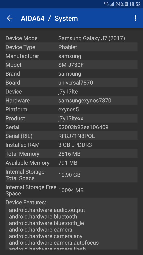 Although the screen had a significant improvement regarding the resolution, the thing that somehow missed all improvements is the chipset. We still have the Exynos 7870 chipset which is a 14nm processor. We’re not saying that this is a bad choice, but why not improve the J7 (2017) compared to the 2016’s edition in this field as well? The CPU is consisted of 8 64bit Cortex-A53 cores clocked at 1.6 GHz. Mali-T830 GPU is in charge of powering those millions of pixels. Multitasking is supported with 3GB of DDR3 RAM, while there are 16GB of storage memory. The thing that is definitely a plus is that the microSD card slot it physically separated from the SIM card slot, so you don’t depend on how many SIM cards you have installed. This device showed fluent work, everything is very quick, and it even showed great performances during playing more demanding games. Overheating is within normal limits, so the device doesn’t drain the battery too much due to “thermal throttling”. Social applications such as Viber, Instagram and Facebook are quite easily executed by the J7 (2017). An excellent addition regarding hardware is definitely the fingerprint scanner which is built into the Home button on the front of the device, and it works – perfectly. The J7 (2017) runs on Android 7.0 Nougat firmware which has been modified by Samsung. The UI looks very nice, it is highly intuitive, Samsung calls it GraceUX and it operates on all Samsung devices which run on Android 7.0 or newer versions. The update to 8.0 Oreo is definitely recommended, but you’ll have to wait a little bit, since Oreo has just now been released for Pixel devices.