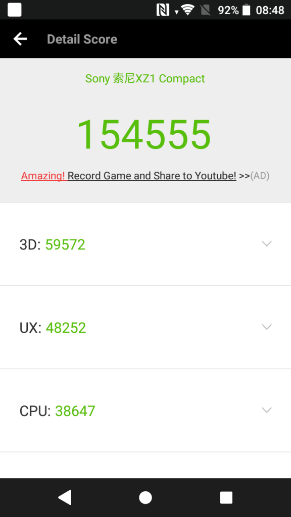 Considering the hardware which is brutally strong, you must be wondering about the performances? They are, in one word – extraordinary. Navigation through the menu is lightning fast, and screen transitions are executed with ease and very fluidly. When we speak about more demanding use – the XZ1 Compact performs brilliantly. No matter what application from the Google Play store you install, from the basic applications and demanding 3D games to complex photo/video editing tools – everything works flawlessly and tremendously quickly. A real little performance bomb! The latest software update combined with low screen resolution and brutally strong hardware makes for excellent results, and guarantees amazing performances. Device scored 154 555 points on AnTuTu Benchmark. Read our blog about AnTuTu Benchmark.
