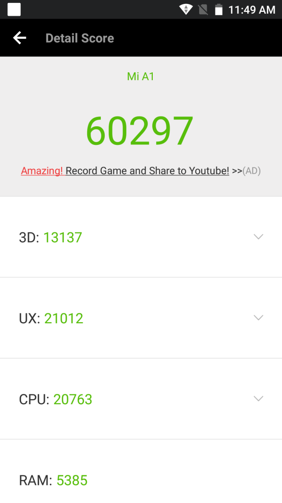 The general feel about this setup is excellent! All animations and transitions are very fluid, and all this is due to great balance between the built-in hardware and stock Android. As we have previously mentioned, the gaming experience is pretty good. A good representative of the capabilities of the Xiaomi Mi A1 is the good old AnTuTu benchmark that showed a score of 62 921 points, and put this device alongside Samsung Galaxy A5 2017, Huawei P10 Lite and Mate 10 Lite devices.