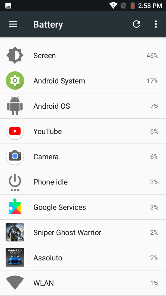 Our device runs on Android Nougat, which means there is no fast charging, so the charging time is just under 2 hours. Average use will bring around 15 to 18 hours of autonomy, which is pretty nice for an average user. SoT (Screen on Time) with one full charge, several hours of gaming and viewing YouTube videos with the brightness set on 60% came up to 6 hours and some minutes, which is very good. Wireless charging is not supported.